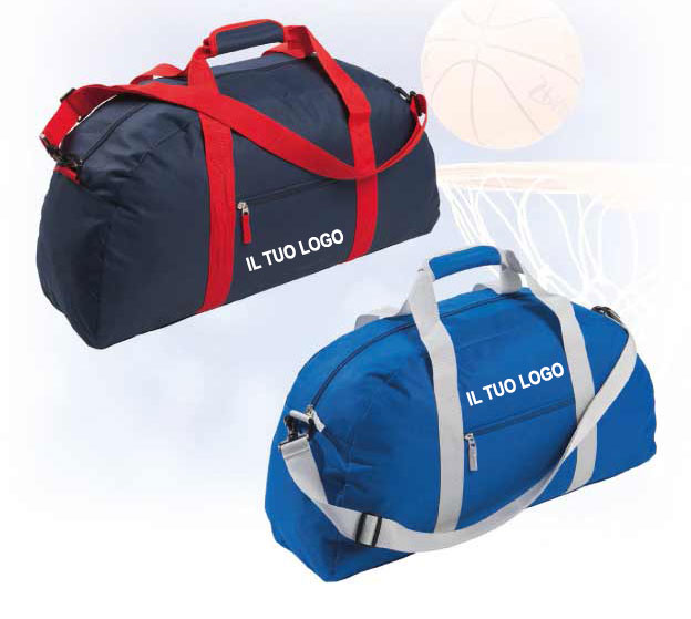 Borsa sport con tasca frontale e tracolla regolabile, tiralampo in tessuto, piedini in plastica, dimensione cm 59x31x20 ca, in nylon, disponibile in 2 colori